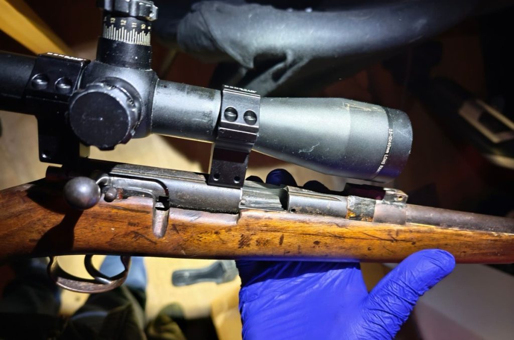 Na miejscu, w trakcie wykonywanych czynności, policjanci zauważyli przedmiot przypominający broń. Podczas dalszych czynności, funkcjonariusze ujawnili łącznie 477 sztuk amunicji różnego kalibru oraz broni długiej z lunetą, a także posiadanie wbrew przepisom ustawy środków odurzających w znacznej ilości w postaci ziela konopi innych niż włókniste o łącznej masie netto 322,542 gramów.