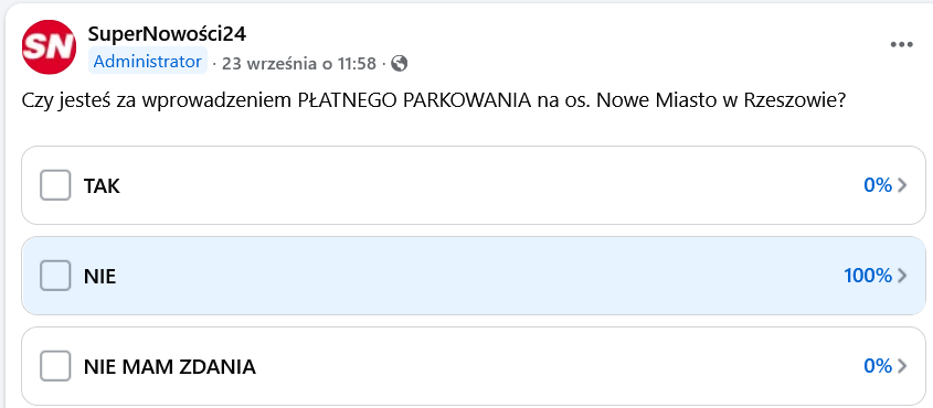 Jeśli chcecie się podzielić z nami swoją opinią na temat pomysłu wprowadzenia strefy płatnego parkowania na os. Nowe Miasto albo macie sygnały, że na innych osiedlach w Rzeszowie są plany jej wprowadzenia, piszcie na: sekretariat@supernowosci24.pl (w tytule maila prosimy wpisać STREFA PŁATNEGO PARKOWANIA) albo komentujcie na naszym Facebooku. Zapraszamy również na grupę na Facebooku – PŁATNE PARKOWANIE – NOWE MIASTO. Tam również możecie wyrażać swoje opinie w tej sprawie.