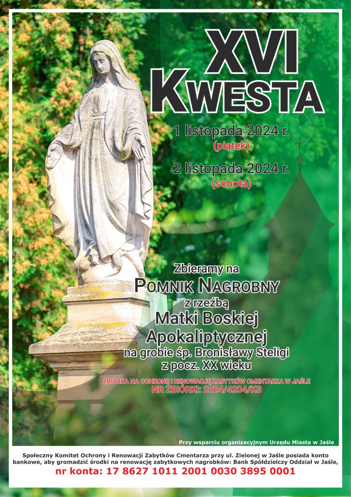 Już po raz 16. Społeczny Komitet Ochrony i Renowacji Zabytków Cmentarza przy ul. Zielonej w Jaśle organizuje przy wsparciu Urzędu Miasta w Jaśle, kwestę na ratowanie cmentarza przy ul. Zielonej w Jaśle. W tym roku odbędzie się ona 1 listopada (piątek) i 2 listopada (sobota), a zebrane datki zostaną przekazane na pomnik nagrobny z rzeźbą Matki Boskiej Apokaliptycznej na grobie śp. Bronisławy Steligi.