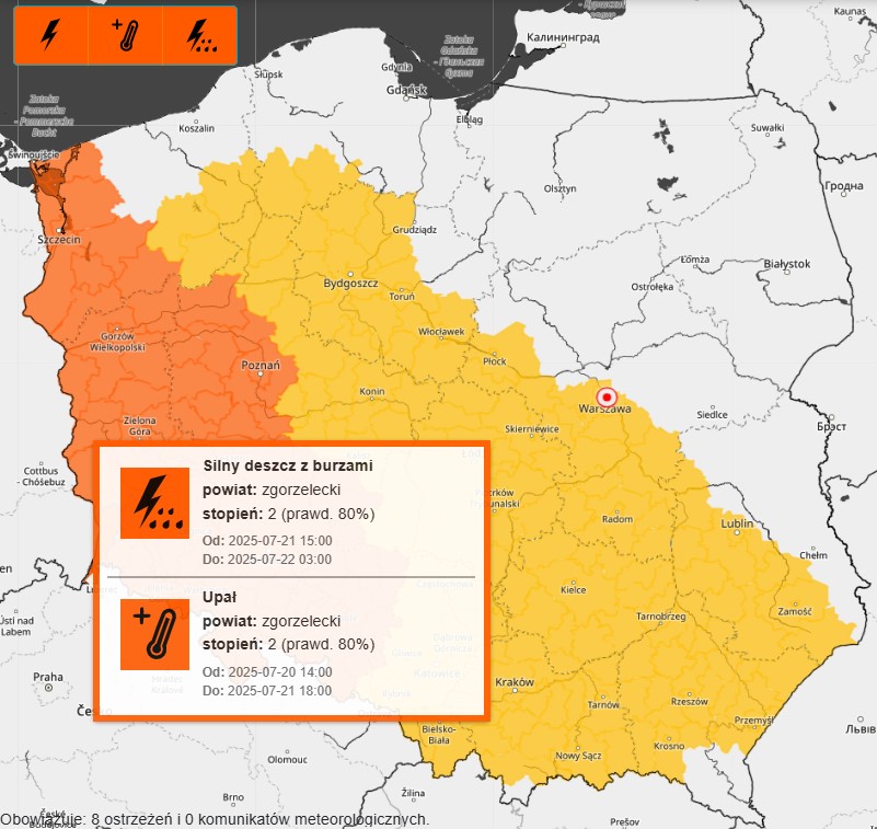 Popołudnie i wieczór przyniosą jednak gwałtowne zmiany w wielu rejonach. Niebezpieczne zjawiska spodziewane są przede wszystkim w pasie od zachodniej części woj. dolnośląskiego po woj. lubuskie i zachodnie powiaty woj. zachodniopomorskiego. Nad tym obszarem przewiduje się intensywne burze oraz długotrwałe ulewy. Ostrzeżenia drugiego stopnia ostrzegają przed opadami nawet do 90 mm oraz wiatrem osiągającym 90 km na godz.