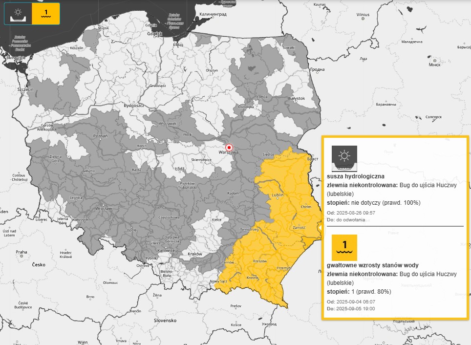 „Obserwowane i prognozowane są burze, którym miejscami będą towarzyszyć silne opady deszczu około 25 mm oraz porywy wiatru do 70 km na godz. Lokalnie grad” – czytamy w alertach pogodowych wydanych przez IMGW. Prawdopodobieństwo wystąpienia zjawisk oceniono na 70 proc., a ostrzeżenia pierwszego stopnia obowiązują do godz. 17 w dużej części województw lubelskiego i podkarpackiego, z wyłączeniem zachodnich części tych regionów. Pierwszy stopień alertu rozciąga się również na powiat gorlicki w województwie małopolskim.