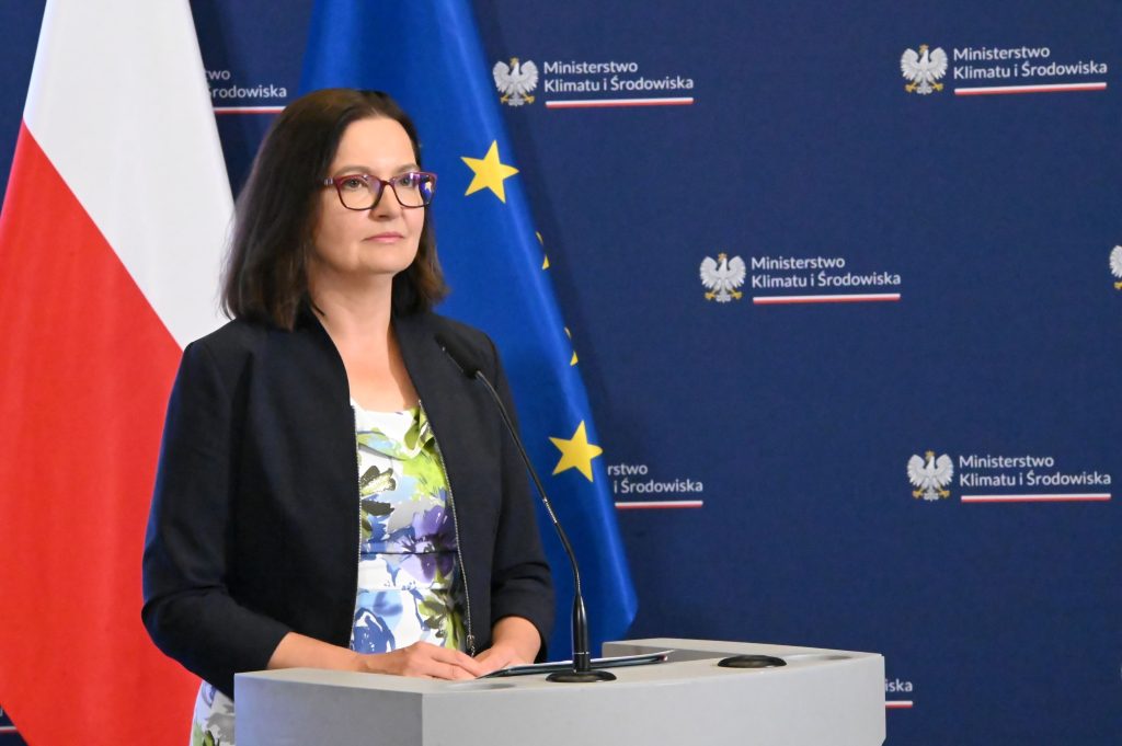 Wiceministra klimatu i środowiska Anita Sowińska na konferencji prasowej nt. systemu kaucyjnego. (Fot. GOV.pl)