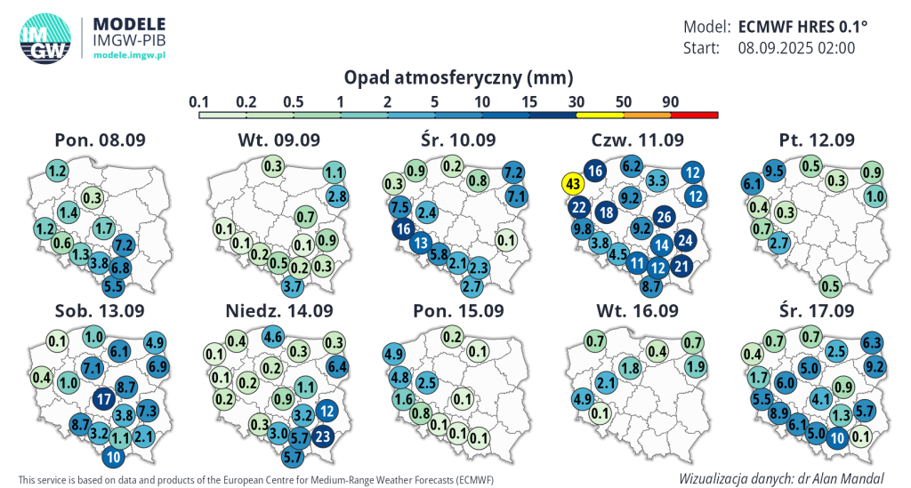 „Prognozowane są burze, którym miejscami będą towarzyszyć bardzo silne opady deszczu od 35 mm do 55 mm, oraz porywy wiatru do 65 km na godz. Lokalnie grad” — informuje IMGW. Ulewne deszcze w tych rejonach mogą odpowiadać nawet całomiesięcznej normie opadów, a prawdopodobieństwo wystąpienia zjawiska oceniono na 90 proc.