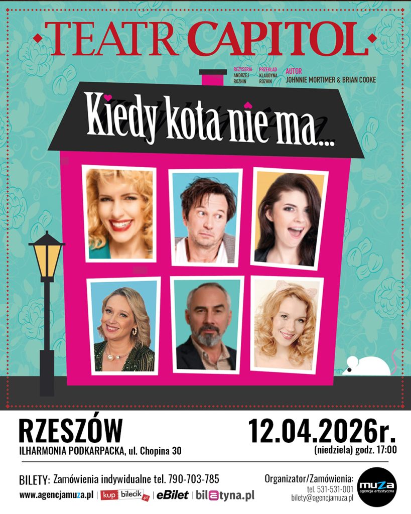 Agencja Artystyczna MUZA zaprasza na ponad 2 godziny dobrego dowcipu, humoru i śmiechu do łez! Już 12 kwietnie o godz. 17 w Filharmonii Podkarpackiej w Rzeszowie znakomita komedia warszawskiego Teatru Capitol „Kiedy kota nie ma…”.