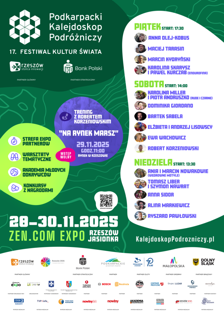 Sobotni poranek upłynie w rytmie ruchu podczas wydarzenia „Na Rynek Marsz!” z Robertem Korzeniowskim i Prezydentem Rzeszowa Konradem Fijołkiem (rzeszowski Rynek, godz. 11:00). Po południu uczestnicy przeniosą się do sali kongresowej ZEN.COM Expo, gdzie o podróżach, odkrywaniu świata i sile pasji opowiedzą m.in. Ewa Wachowicz, Bartek Sabela, Dominika Giordano, Karolina Miller i Piotr Andruszko (znani jako Rude i Czarne). Kulminacyjnym punktem dnia będzie inspirujące spotkanie z Robertem Korzeniowskim – „Z Rzeszowa na Olimp, czyli w 20 lat dookoła świata”.