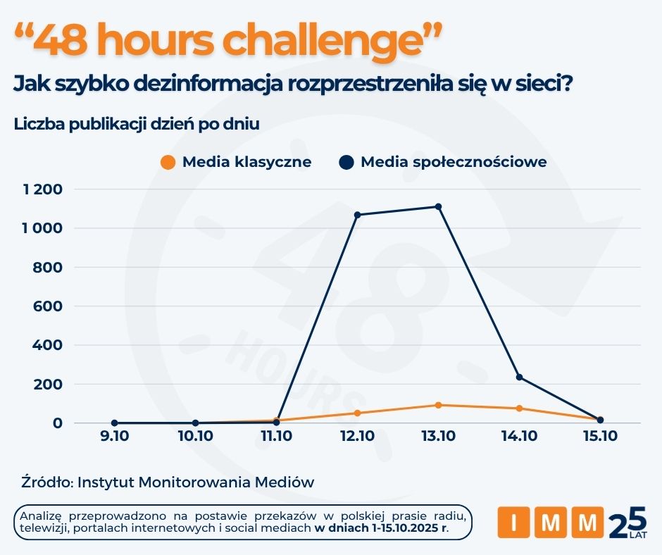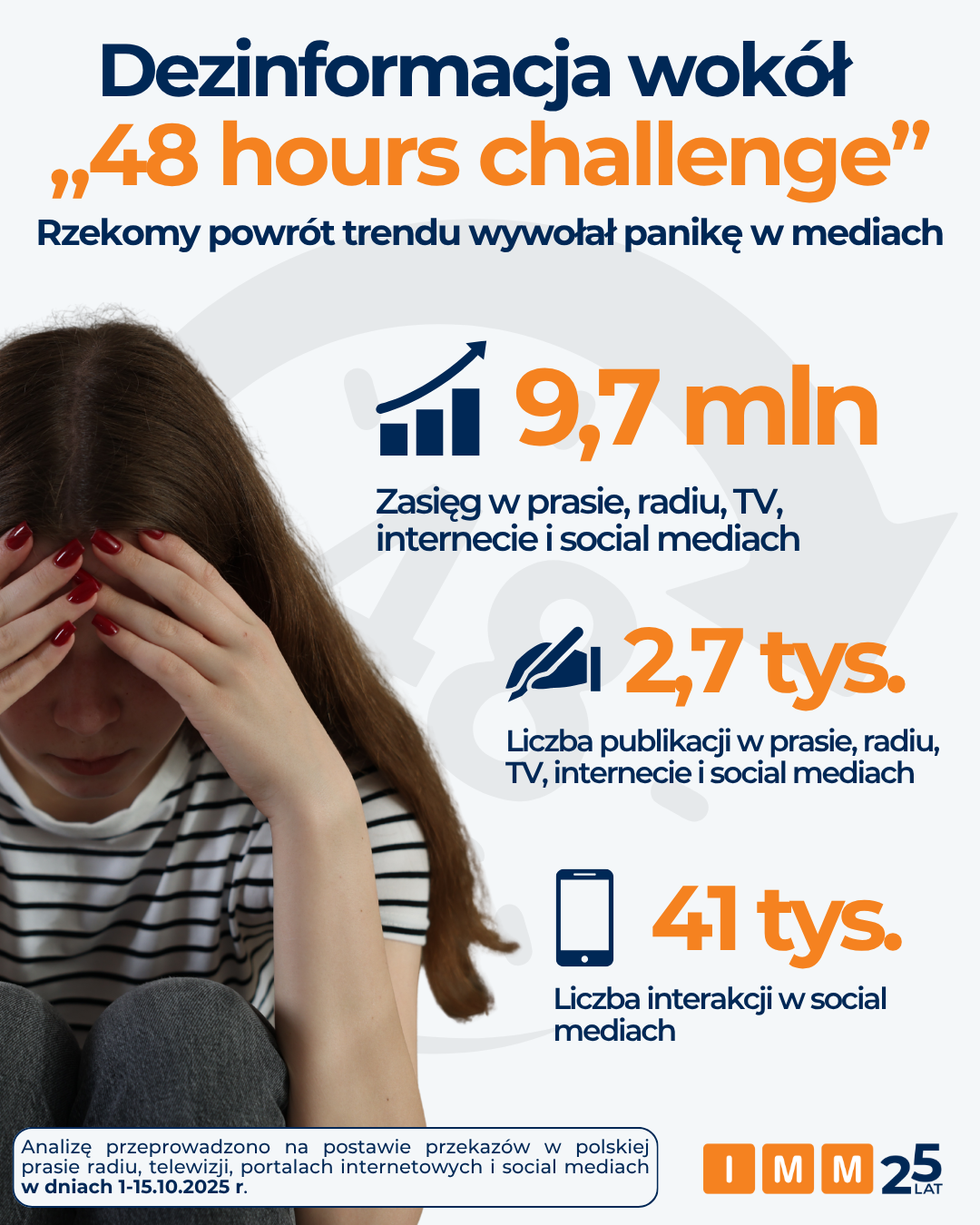 „48 hours challenge” – „gra” polegająca na zniknięciu nastolatków na 48 godzin – niemal nie istniała w przestrzeni cyfrowej od 2023 roku. Dopiero po medialnych doniesieniach o zaginięciu dwójki nastolatków z Rzeszowa temat został reaktywowany – pomimo braku jakichkolwiek dowodów na związek sprawy z niebezpiecznym internetowym „wyzwaniem”. W zaledwie pięć dni wątek pojawił się w blisko 2,7 tys. publikacjach dziennikarskich i w social mediach. Wygenerował 9,7 mln kontaktów z przekazem, co oznacza, że średnio co trzecia statystyczna osoba w Polsce usłyszała w tym czasie o „48 h challenge” w mediach – czytamy w informacji przesłanej przez Instytut Monitorowania Mediów.