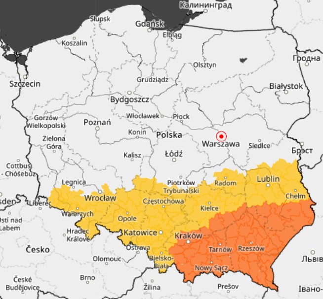 IMGW zapowiada, że burze rozwiną się w wielu częściach kraju, z wyjątkiem północy i północnego wschodu. Szczególnie dotknięte będą obszary od środkowej oraz południowej Lubelszczyzny przez Podkarpacie, aż po wschodnie i południowe części województwa dolnośląskiego. W miejscach tych obowiązywać będą alerty meteorologiczne pierwszego stopnia, a na Podkarpaciu, w południowych regionach województwa lubelskiego i świętokrzyskiego oraz znaczącej części Małopolski — ostrzeżenia drugiego stopnia. Mają one być aktywne od godz. 13 do 23 – czytamy w Onecie.