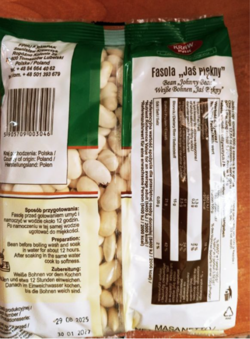 Wyniki urzędowej kontroli Państwowej Inspekcji Sanitarnej ujawniły przekroczenie najwyższego dopuszczalnego poziomu (NDP), pozostałości pestycydu – chlorpiryfosu w fasoli „Jaś Piękny” polskiego producenta.