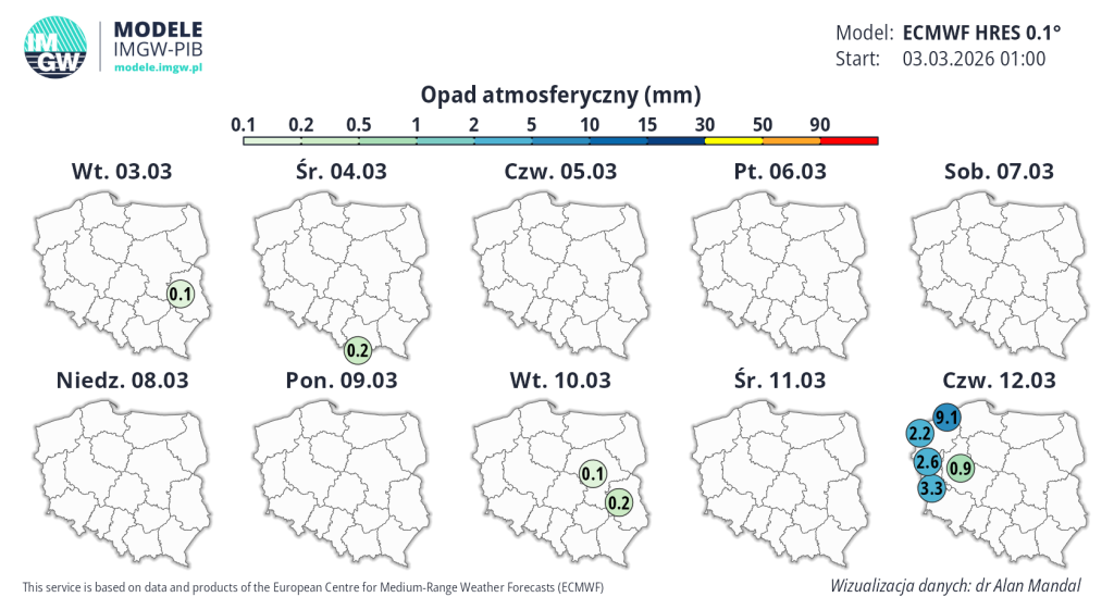 Na mapach prognozowanych sum opadów do połowy marca Polska jawi się jako biała plama – symbolizująca brak deszczu. Podobnie wygląda sytuacja w dużej części Europy. Jeśli sytuacja szybko się nie zmieni, marzec może zapisać się jako jeden z najsuchszych w historii.