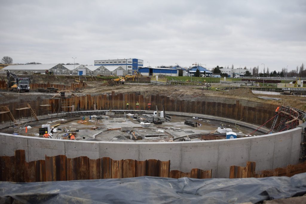 Wykonano już umocnienia wykopu grodzicami stalowymi, przełożono kable elektroenergetyczne kolidujące z komorą krat. W trakcie realizacji są wykopy pod zbiornik retencyjny, izolacja przeciwwilgociowa i beton na dnie zbiornika oraz prace ciesielsko-zbrojarskie i betonowanie płyty dennej, ścian zbiornika oraz belek i podciągów.