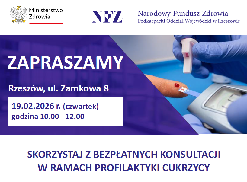 Podkarpacki NFZ zaprasza mieszkańców na wydarzenie profilaktyczne poświęcone cukrzycy, które odbędzie się w siedzibie NFZ przy ul. Zamkowej 8 w Rzeszowie 19 lutego (czwartek), w godzinach od 10 do 12.