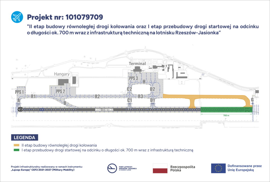 Inwestycja jest współfinansowana ze środków Unii Europejskiej w ramach instrumentu „Łącząc Europę” 2021-2027 (CEF Military Mobility). Wśród najważniejszych zadań jest budowa II etapu równoległej drogi kołowania, dwóch prostopadłych łączników drogi kołowania z drogą startową oraz nawierzchni do zawracania samolotów przy progu od wschodniej części lotniska, a także przebudowa istniejącej drogi startowej na odcinku 700 m od tej samej strony, z niezbędną infrastrukturą towarzyszącą. Prace będą realizowane etapami, w taki sposób, by nie zakłócać działalności lotniska.
