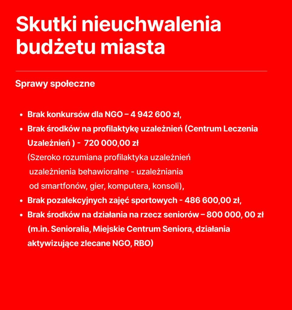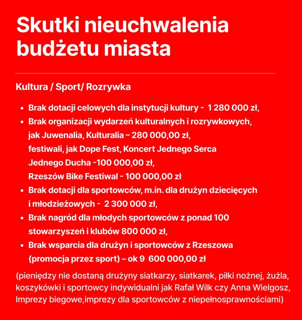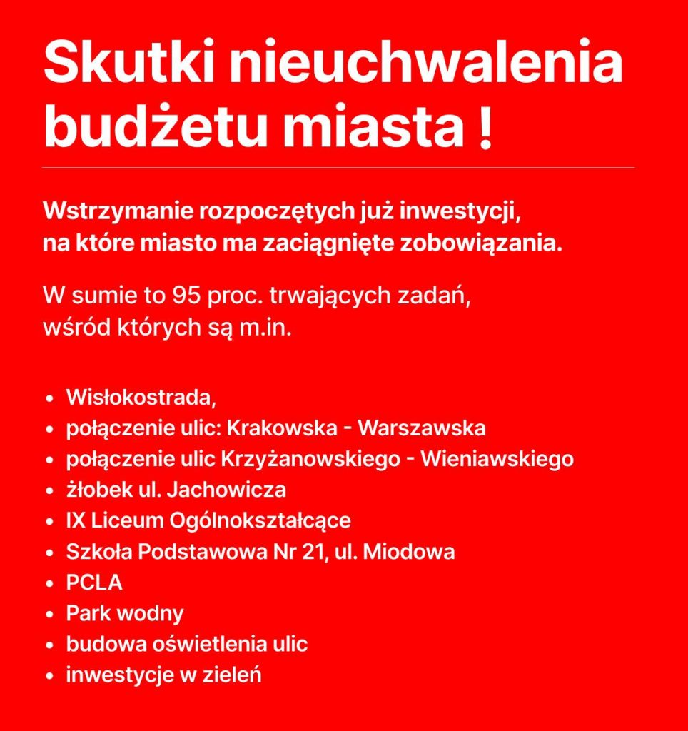 – Jutro będę zmuszony polecić przygotowanie procedur rozwiązania umów o dofinansowanie i realizację inwestycji które trwają w mieście. Wstrzymane zostaną również konkursy w dziedzinie sportu, kultury, polityki społecznej, wsparcie dla NGO i Rzeszowski Budżet Obywatelski – napisał z kolei we wtorek wieczorem na FB Konrad Fijołek, prezydenta Rzeszowa, dołączając do wpis listę zadań, które wobec braku budżetu, będą musiały zostać wstrzymane.