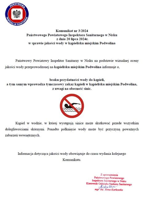 Tym razem chodzi o kąpielisko miejskie Podwolina. Jednocześnie Zarząd Budynków Komunalnych i Zieleni Miejskiej w Nisku informuje, że chociaż od 20 lipca (sobota) z powodu zakwitu sinic kąpielisko miejskie Podwolina jest zamknięte, „to wszystkie punkty gastronomiczno-handlowe są otwarte. Do Państwa dyspozycji pozostają otwarte też wypożyczalnia sprzętu wodnego oraz park linowy i inne ogólnodostępne atrakcje”.
