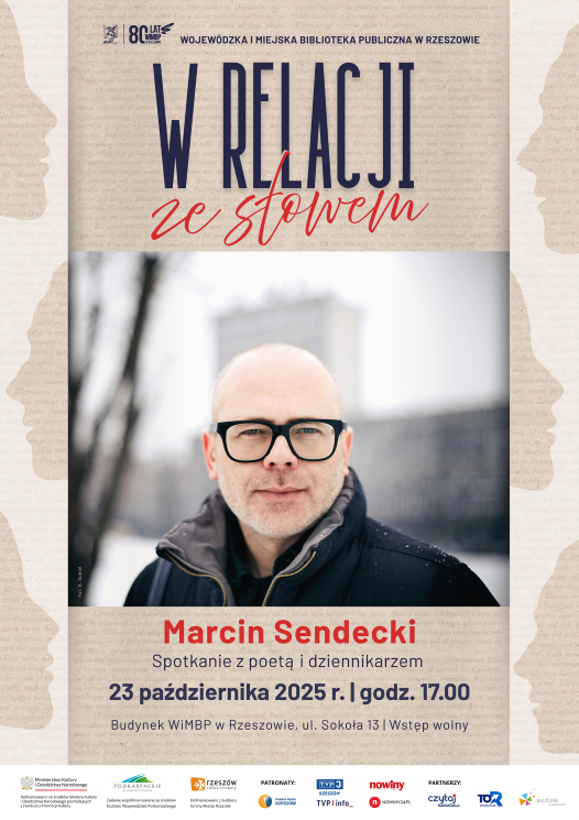 Wojewódzka i Miejska Biblioteka Publiczna w Rzeszowie zaprasza na spotkanie z Marcinem Sendeckim – poetą i dziennikarzem, które odbędzie się 23 października o godz. 17 w budynku WiMBP przy ul. Sokoła 13. Wydarzenie w ramach projektu W relacji ze słowem. Wstęp wolny.