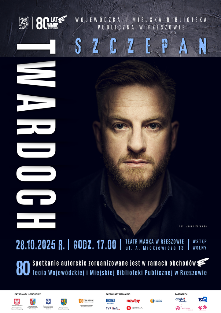 Wojewódzka i Miejska Biblioteka Publiczna w Rzeszowie zaprasza na spotkanie ze Szczepanem Twardochem – jednym z najpoczytniejszych pisarzy w Polsce, które odbędzie się 28 października o godz. 17 w Teatrze Maska w Rzeszowie, ul. A. Mickiewicza 13. Wstęp wolny.