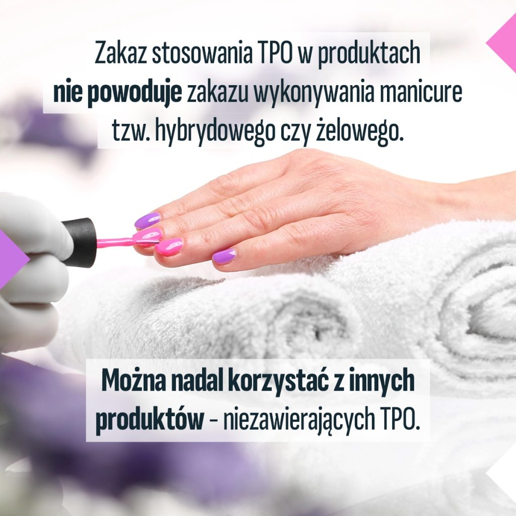 Zakaz stosowania TPO w produktach nie powoduje zakazu wykonywania stylizacji paznokci – manicure tzw. hybrydowego czy żelowego. Można korzystać z produktów niezawierających TPO.