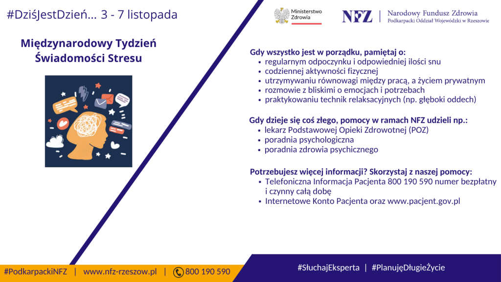 Podkarpacki NFZ stawia na profilaktykę i zdrowie pacjentów. Chce obalać mity, wyjaśniać wątpliwości i pokazywać sprawdzone rozwiązania, które naprawdę pomagają. Regularnie przypomina, jak ważna jest profilaktyka i wczesne wykrywanie chorób – to one często decydują o zdrowiu i długim życiu. W ramach cyklu „Dziś jest dzień…” przygląda się wybranym tematom związanym ze zdrowiem mieszkańców Podkarpacia. 7 listopada kończy się Międzynarodowy Tydzień Świadomości Stresu.