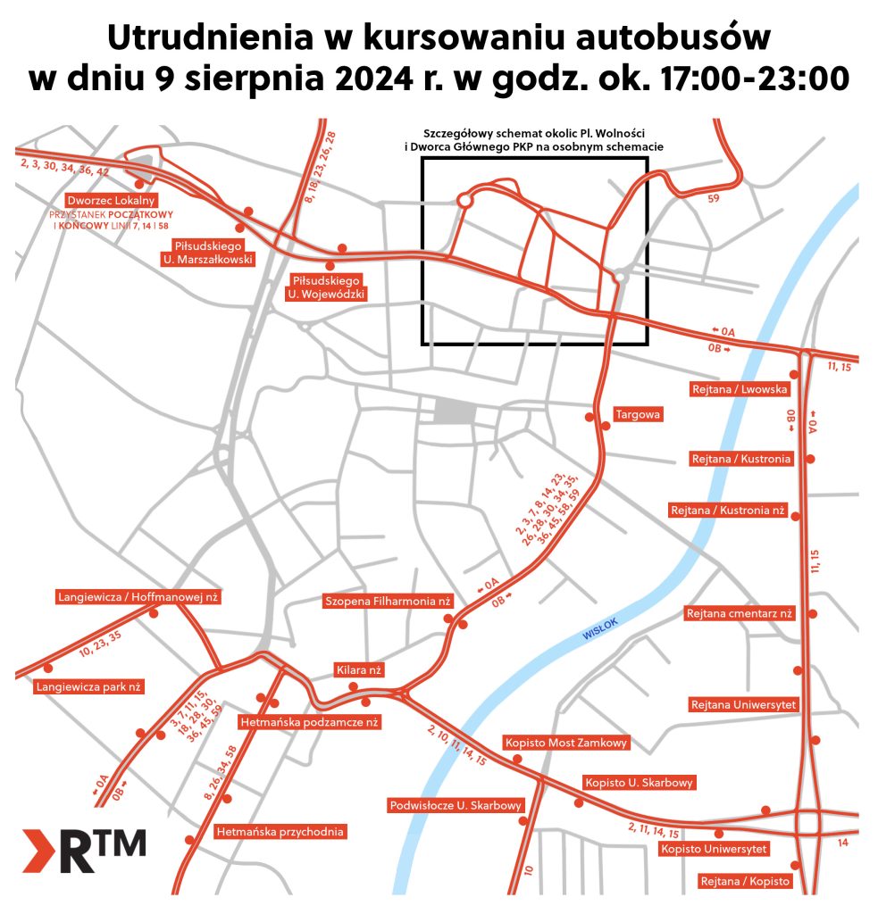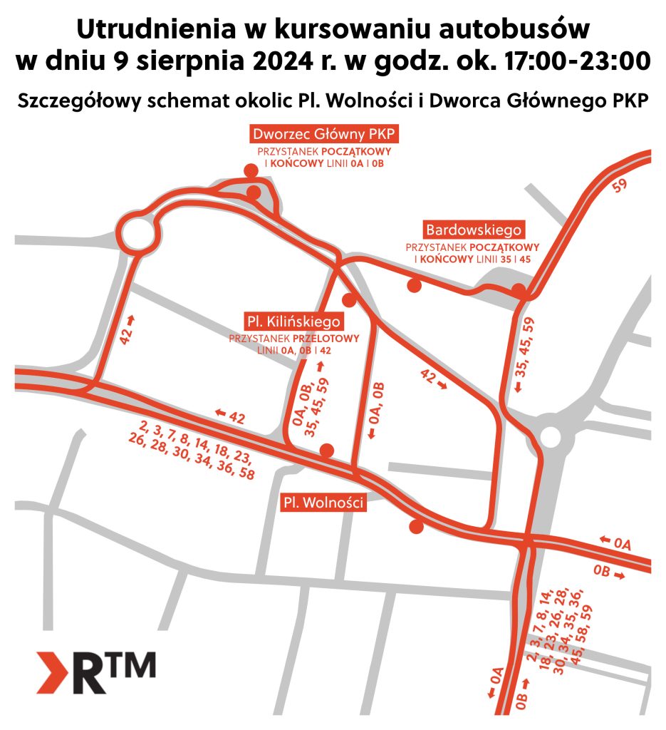 * Linie 8, 18, 23, 26, 28 do przystanku Marszałkowska 01 bez zmian, następnie Piłsudskiego U. Wojewódzki 03 – Pl. Wolności – Targowa – Szopena – Kilara – Langiewicza/Dąbrowskiego/Hetmańska i dalej trasą bez zmian