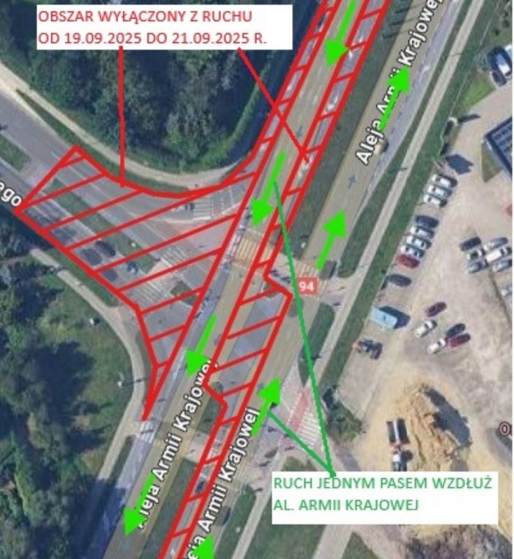 Utrudnienia związane będą z układaniem warstwy ścieralnej nawierzchni na przebudowywanym skrzyżowaniu ul. Krzyżanowskiego i al. Armii Krajowej. Zakończenie prac planowane jest na niedzielę (21.09).