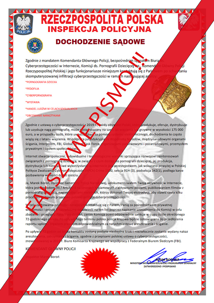 W celu uwiarygodnienia swojej wiadomości przestępcy podpisują ją, jako Komendant Główny Policji insp. Marek Boroń i Ministerstwo Sprawiedliwości Prokurator Generalny Adam Bodnar.