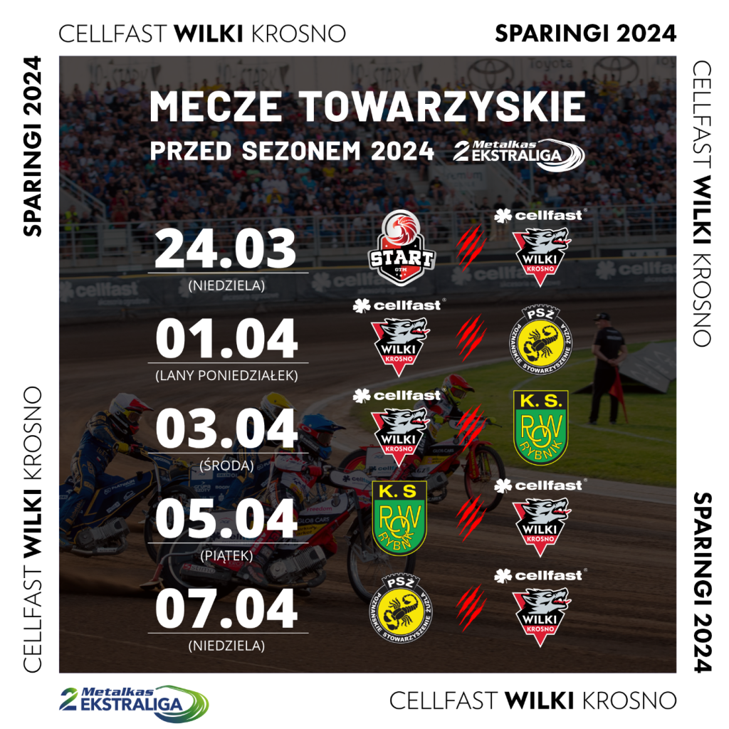 – Możemy już oficjalnie ogłosić nasz kalendarz sparingowy na ten sezon. Zapowiadają się solidne przygotowania przed rozgrywkami. Mamy sporo czasu, pogoda sprzyja, więc postaramy się do tego sezonu przygotować należycie. Na początek czeka nas sparing z jednym z faworytów Krajowej Ligi Żużlowej – GTM Startem Gniezno – mówi menedżer Cellfast Wilki Krosno, Michał Finfa, cytowany przez stronę internetową krośnieńskiego klubu.