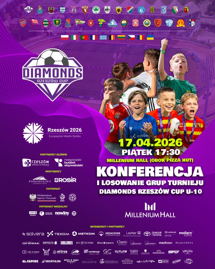 W piątek (17 kwietnia) o godz. 17.30 w Millenium Hall Rzeszów rozlosowane zostaną grupy piłkarskiego turnieju Diamonds Cup Rzeszów 2026, który już w przyszły weekend (25-26 kwietnia) rozegrany zostanie na stadionie przy ul. Hetmańskiej.
