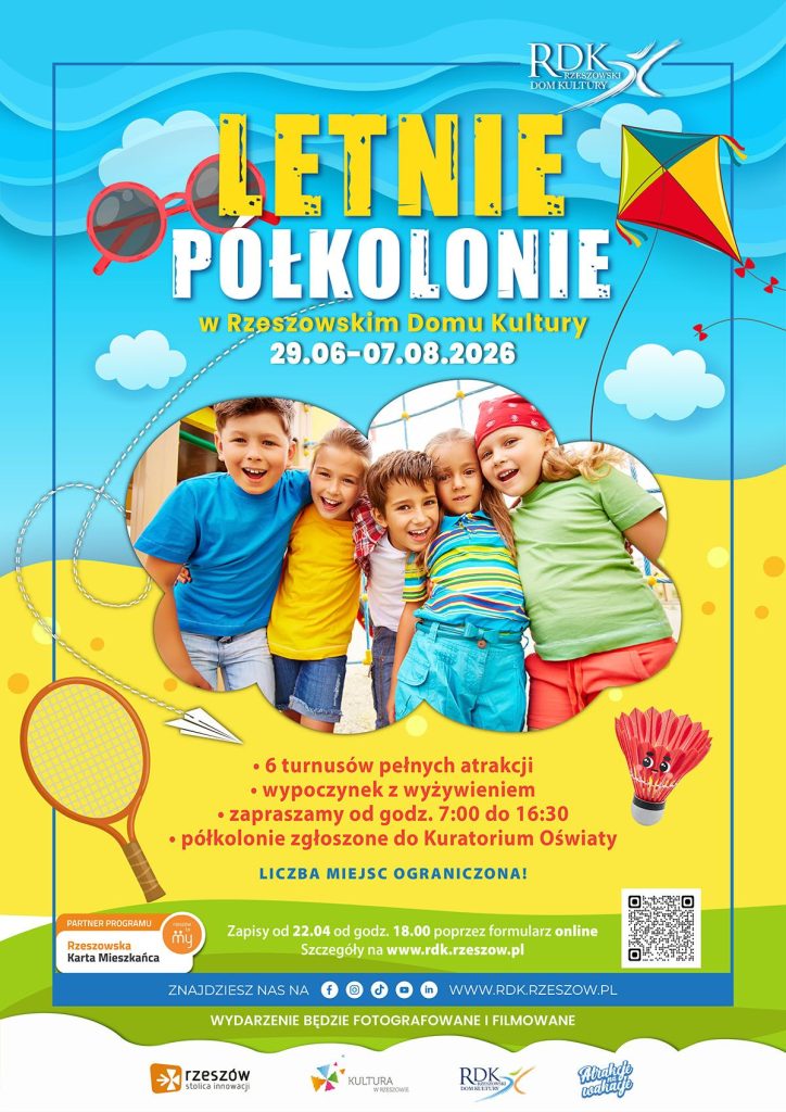 Rzeszowski Dom Kultury zadbał o dużą liczbę placówek, w których odbędą się półkolonie. W tym roku to 15 filii RDK: Biała, Country, Dąbrowskiego, Karolinka, Krynicka, Miłocin, Pobitno, Przybyszówka, Słocina, Staromieście, Staroniwa, Wilkowyja, Zalesie, Załęże, Zwięczyca. Wypoczynek został podzielony na 6 turnusów, które będą odbywać się w terminie od 29 czerwca do 7 sierpnia 2026 roku, od poniedziałku do piątku w godzinach 7:00-16:30.