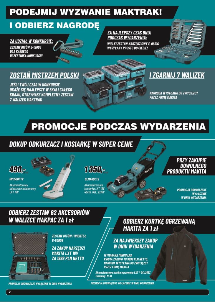 - Wyzwanie MAKTRAK: Sprawdź swoją precyzję i szybkość! Buduj wieżę z systemowych skrzyń na czas. Dla każdego uczestnika przygotowaliśmy zestaw bitów, a najlepsi w kraju powalczą o gigantyczny zestaw 7 walizek MAKTRAK!