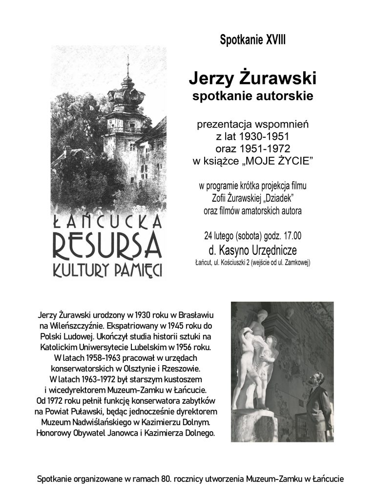 To już XVIII odsłona Łańcuckiej Resursy Kultury Pamięci. W sobotę, 24 lutego w dawnym Kasynie Urzędniczym gościć będzie Jerzy Żurawski, starszy kustosz i wicedyrektor tutejszego Muzeum-Zamku w latach 1963-1972, autor dwutomowych wspomnień „Moje życie”.