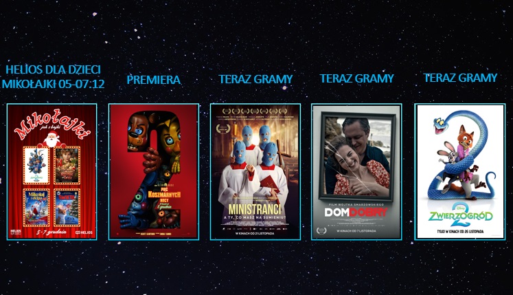 W najbliższym tygodniu widzowie będą mogli zobaczyć premierowe seanse filmów: „Pięć koszmarnych nocy 2”, „Mikołaj i ekipa” oraz „Mysz-masz na święta”. Na ekranach zagoszczą też lubiane cykle sieci, takie jak Kino Kobiet. Ponadto z okazji Mikołajek kina Helios przygotowały specjalne projekcje z konkursami dla najmłodszych!