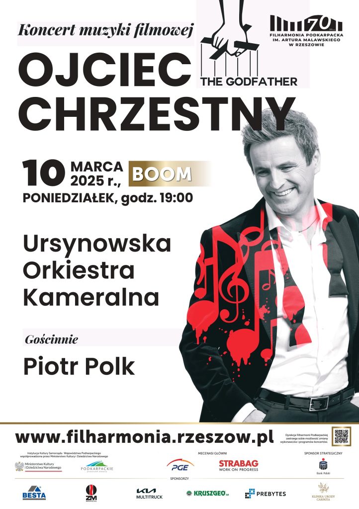 Na poniedziałkowym koncercie zabrzmi zaś znakomita muzyka Nino Roty ze ścieżki dźwiękowej trylogii filmowej „The Godfather”. Aranżacji na potrzeby koncertu dokonał Jerzy Cembrzyński – kompozytor, aranżer, kontrabasista, laureat nagrody Grammy, koncertmistrz i solista Filharmonii Narodowej. Wykonawcami będą Ursynowska Orkiestra Kameralna „Finitimus” oraz znany śpiewający aktor Piotr Polk – prowadzenie i śpiew.