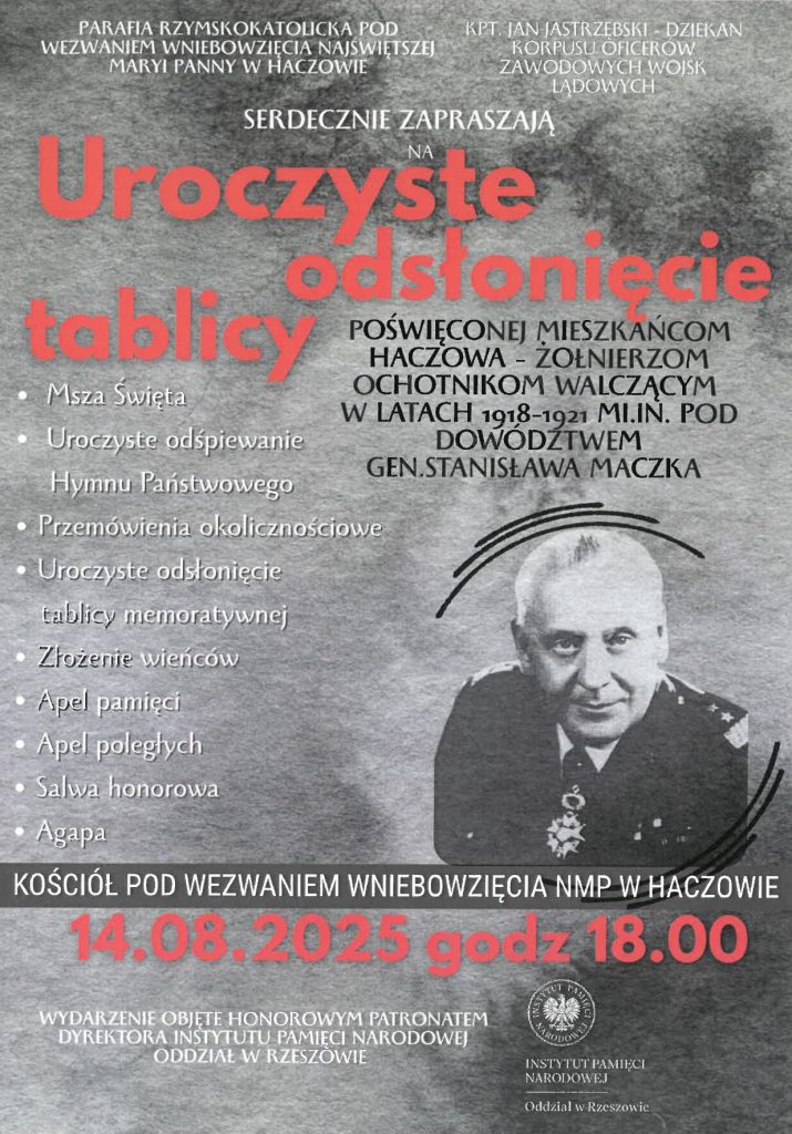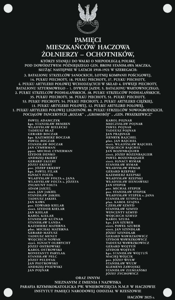 W czwartek, 14 bm., w Haczowie odbędzie się odsłonięcie tablicy, która upamiętni 91 żołnierzy-ochotników m. in. z tej miejscowości. Służyli oni w latach 1918 – 1921 w szeregach: 3 Batalionu Strzelców Samockich, Lotnej Kampanii Pościgowej, 14 Pułku Piechoty, 18 Pułku Piechoty, 37 Pułku Piechoty i innych formacji wojskowych.
