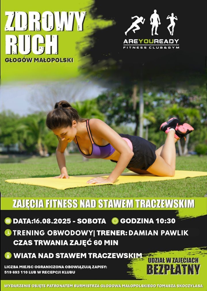 W sobotę, 16 sierpnia, o godz. 10.30 nad stawem Traczewsiim w Głogowie Młp. odbędzie się kolejna odsłona wakacyjnych zajęć „Zdrowy Ruch” organizowanych przez siłownię AreYouReady Fitnes Club&Gym. Tym razem trener Damian Pawlik poprowadzi trening obwodowy – dynamiczne ćwiczenia całego ciała. Zajęcia potrwają 60 minut, są całkowicie bezpłatne, ale obowiązują wcześniejsze zapisy – liczba jiejsc jest ograniczona.