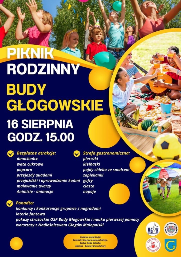 W sobotę, 16 sierpnia, od godz. 15 plac przy Domu Ludowym w Budach Głogowskich zamieni się w kolorową przestrzeń pełną zabawy, śmiechu i rodzinnej radości. Na uczestników czekają bezpłatne atrakcje: dmuchańce, wata cukrowa, popcorn, przejażdżki quadami i konno, animacje oraz konkursy z nagrodami. W strefie gastronomicznej będzie można skosztować pierożków, kiełbasek, pajd chleba ze smalcem, zapiekanek, gofrów, ciast i zimnych napojów. Organizatorzy przewidzieli również pokazy strażackie oraz warsztaty z Nadleśnictwem Głogów Młp.