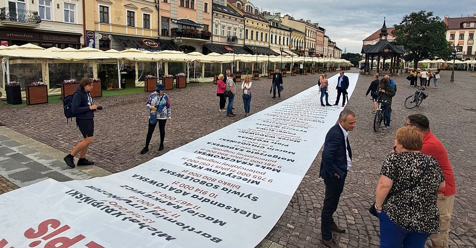 Ponad 50 metrów miała rolka z nazwiskami „tłustych kotów” z PiS. Na rynku w Rzeszowie rozwinęli ją działacze Platformy Obywatelskiej. Jak podliczyli – „pisowcy” na państwowych posadach zarobili 350 mln zł.