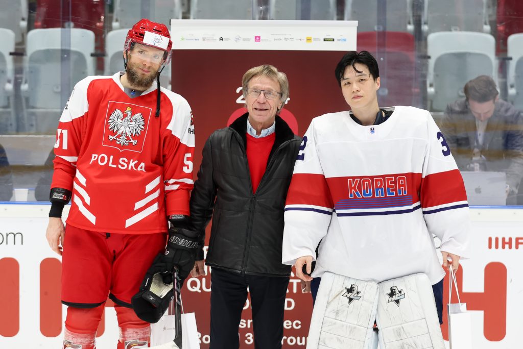 Wiesław Jobczyk (w środku) strzelec trzech goli w legendarnym meczu z ZSRR obok Jakub Wanacki i Lee Younseung przed spotkaniem prekwalifikacji do IO.