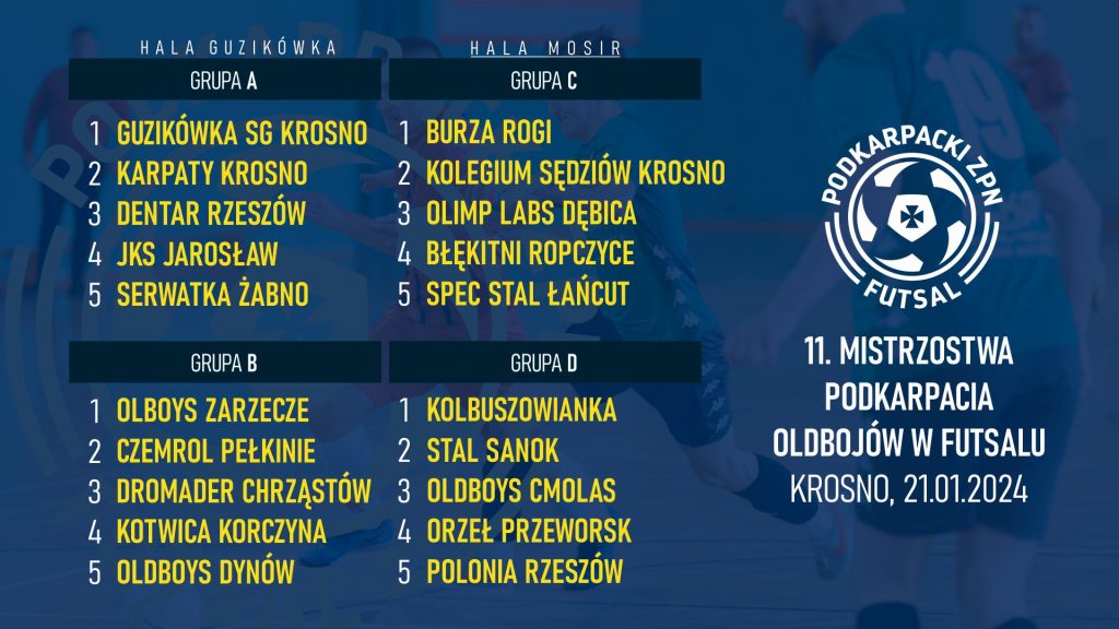 W grupie D (mecze – hala MOSiR Krosno, start godz. 12.30) zagrają Kolbuszowianka, Stal Sanok, Oldboys Cmolas, Orzeł Przeworsk i Polonia Rzeszów.