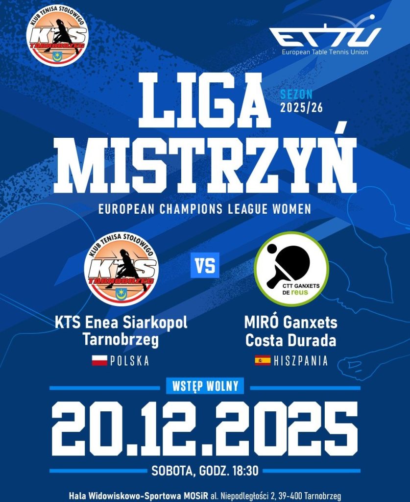 20 grudnia tenisistki stołowe KTS Enea Siarkopol Tarnobrzeg mogą przypieczętować awans do ćwierćfinału Ligi Mistrzyń. O godz. 18.30 zagrają w hali MOSiR z hiszpańskim MIRO Ganxets Costa Durada, a spotkanie transmitować będzie TVP Sport.