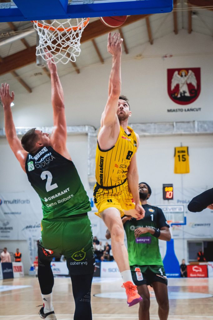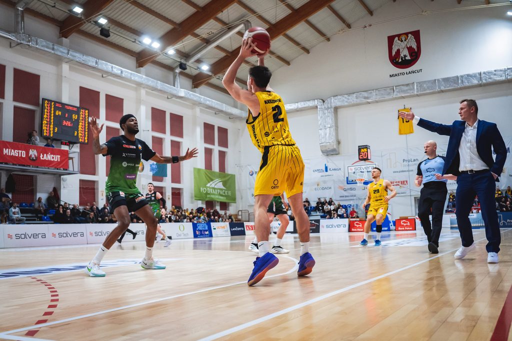 Gospodarze efektownie rozpoczęli mecz prowadząc 10:2 czy też 21:11. Gdy kontuzji skręcenia kostki w ekipie gości doznał jej lider i najlepiej podający gracz I ligi Jakub Kobel (śr. 8,7 asysty na mecz, 19,2 pkt) wydawało się, że łańcucianie, w szeregach których z kolei nie zagrał z powodu choroby Maciej Kucharek, nie będą mieli większych problemów z wygraną. Rywale szybko jednak wyszli z trudnej sytuacji, odrobili straty i walczyli do samego końca o zwycięstwo.