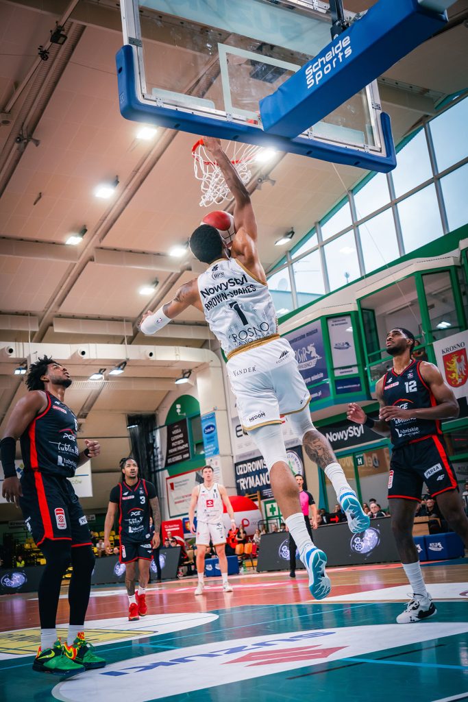 Na początku III kwarty zespół trenera Edmundsa Valeiko rozpoczął od serii 11:2 i prowadził 48:40. W ekipie gospodarzy rozkręciła się Estoński strzelec Leemet Bockler. Lublinianie nie dawali za wygraną. Tercet – Tevin Mack, Elijah Hawkins i Quincy Ford sprawił, że po III kwartach PGE Start prowadził 63:60. W połowie IV kwarty natomiast 73:71. Krośnianie odpowiedzieli ośmioma punktami z rzędu i na niespełna trzy minuty przed końcem wygrywali 79:73. Goście „trójkami” doprowadzili do remisu. Na 53 sekundy przed końcem Quincy Ford w podkoszowej walce faulował Terella Browna-Soaresa, ale sam mocno ucierpiał, bo z podejrzeniem pęknięcia kości jarzmowej opuścił boisko. Center Miasta Szkła wykorzystał oba rzuty wolne, ale w odpowiedzi trafił Tevin Mack i na 30 sekund przed końcową syreną był remis 81:81.