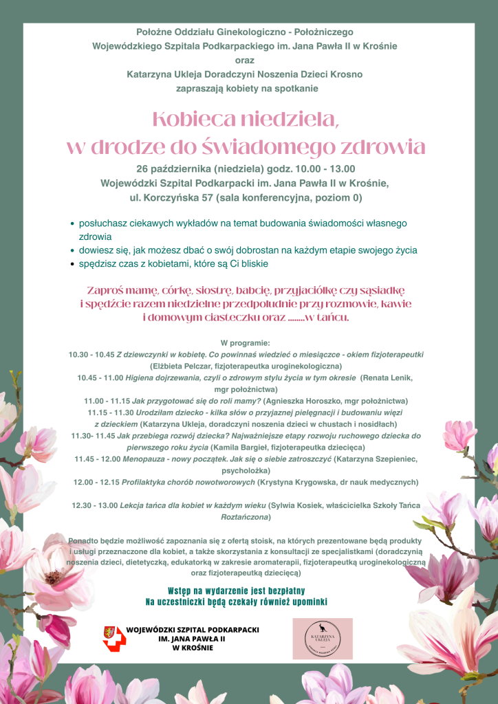 26 października (niedziela), w godz od 10 do 13, w sali konferencyjnej Wojewódzkiego Szpitala Podkarpackiego w Krośnie przy ul. Korczyńskiej 57 (poziom 0), odbędzie się spotkanie pn. „Kobieca niedziela, w drodze do świadomego zdrowia”.
