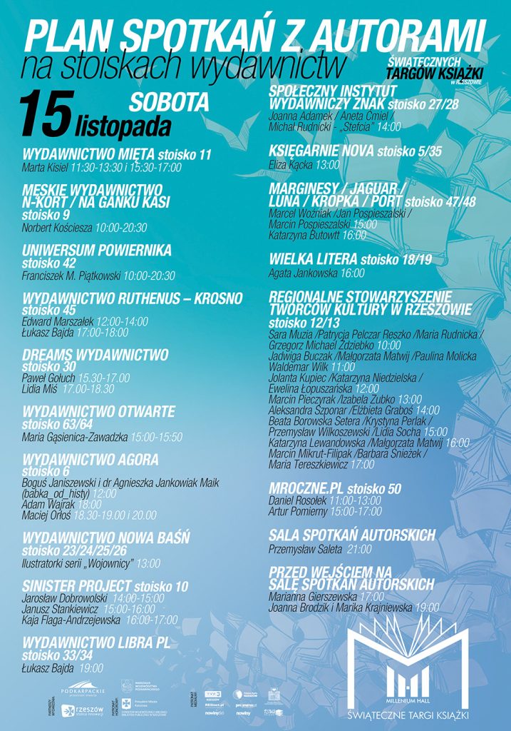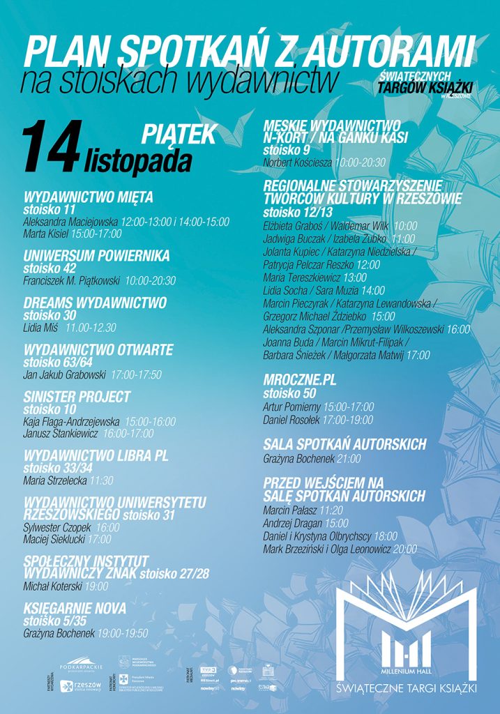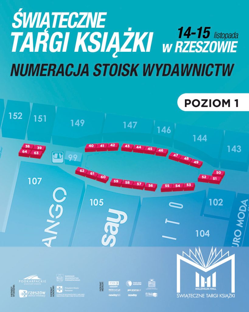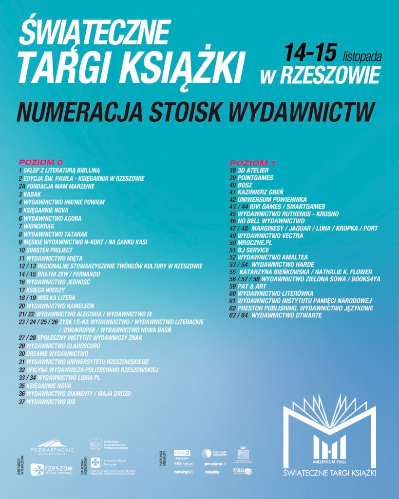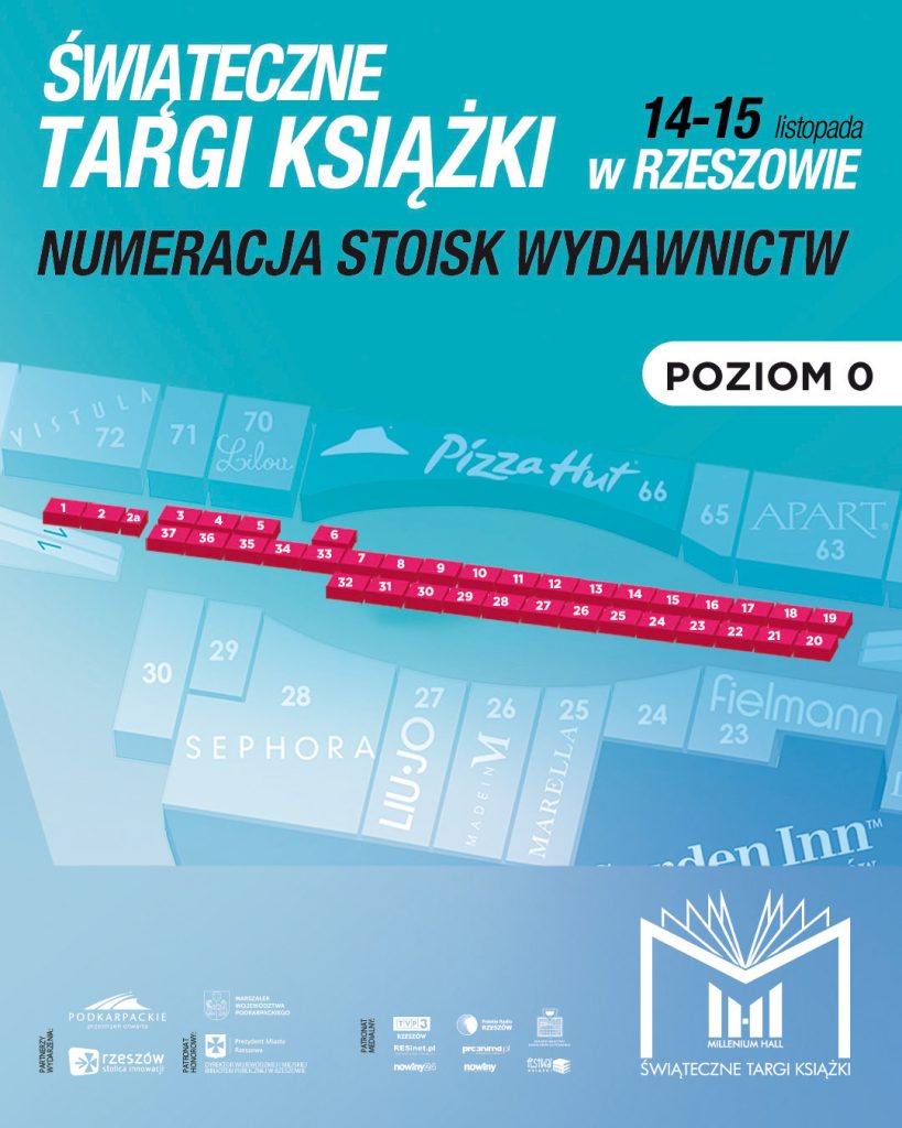 Stoiska wydawców tradycyjnie zostaną rozmieszczone na dwóch piętrach Millenium Hall, a spotkania autorskie odbędą się na poziomie 2, w salach konferencyjnych Hilton Garden Inn Rzeszów. Wstęp na wszystkie wydarzenia Świątecznych Targów Książki w Rzeszowie jest bezpłatny.